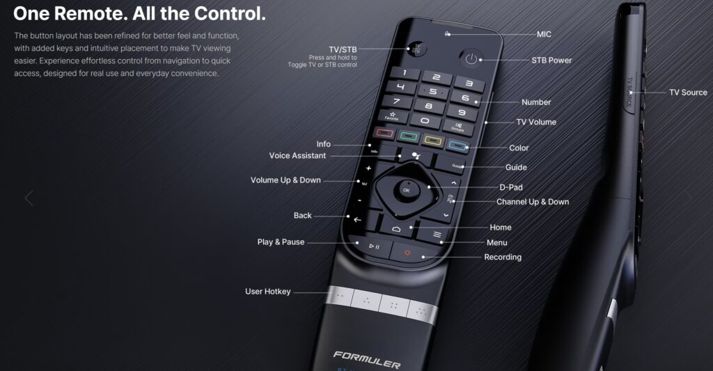 - Formuler BT3 Bluetooth remote control (with backlight, voice control, TV‑learning function, and “Find My Remote”)